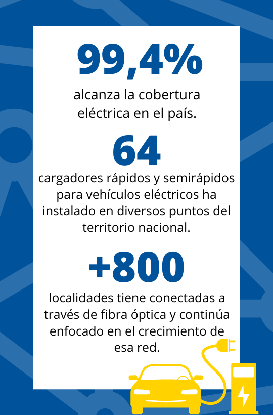 El impulso a una matriz eléctrica renovable y diversificada, que hoy respalda la electromovilidad en el país, así como el desarrollo de una amplia red de fibra óptica, son muestra del aporte del Grupo ICE en innovación y soluciones tecnológicas para el desarrollo socioeconómico y ambiental de Costa Rica.